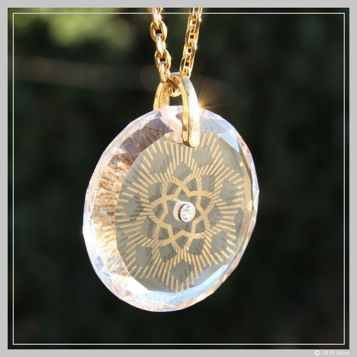 Hochwertiges, brillierendes Zirkonia-Medaillon, mit feinem Schliff, echtem Goldinlay “Ashtar-Stern”, sowie einem brillierenden, Zirkonia-Diamanten, eingefasst, in der Mitte, mit feiner Lochbohrung am oberen Ende.