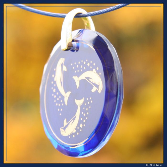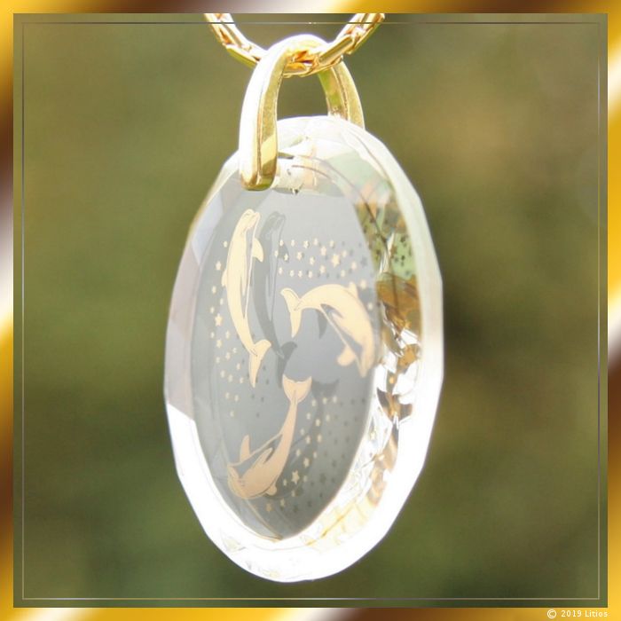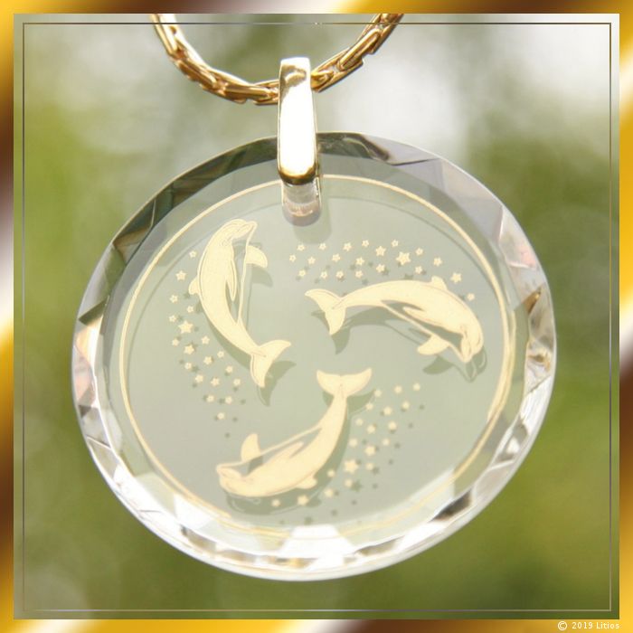 Hochwertige Glas-Scheibe mit fein geschliffenen Facetten und echtem Goldinlay “Springende Delfine”.