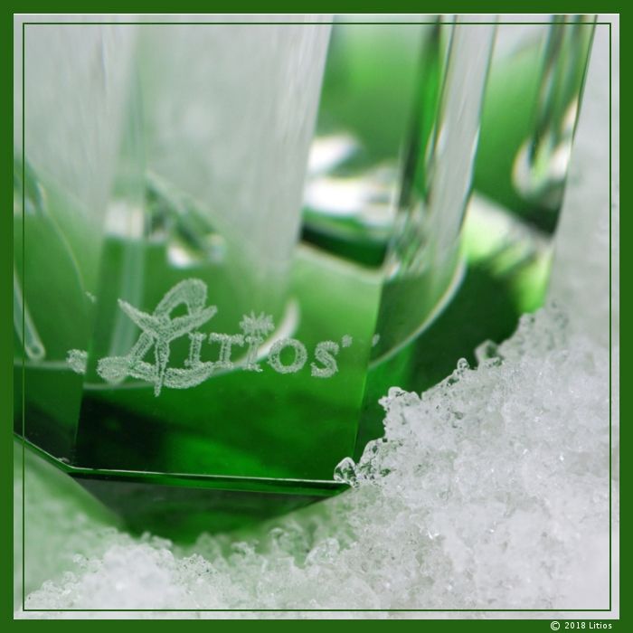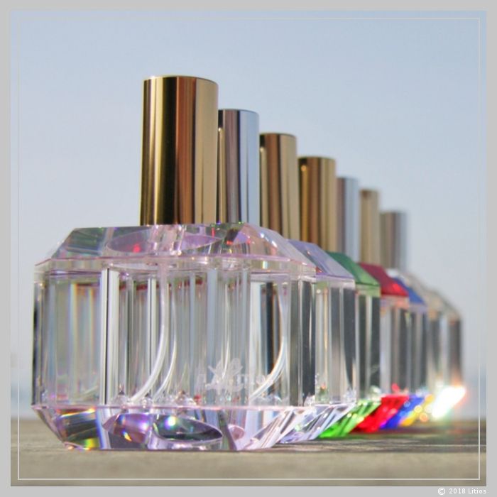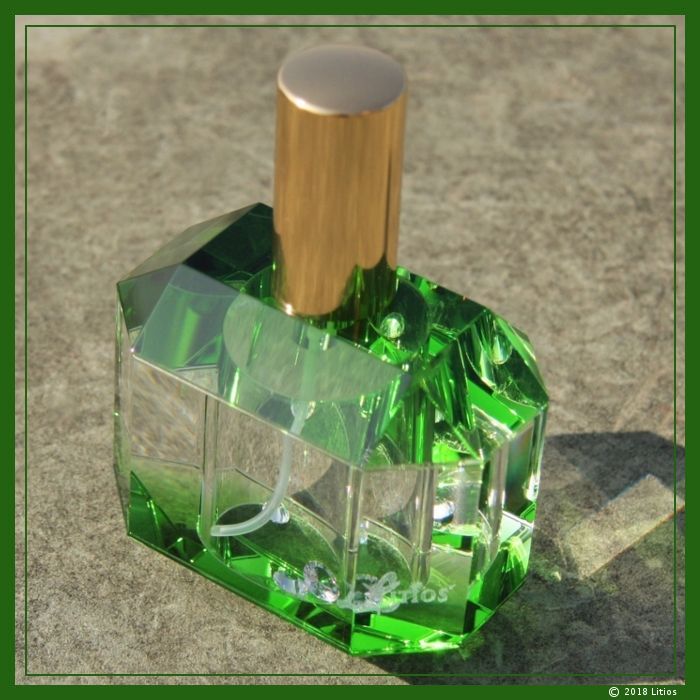 Hochwertiger Glas-Flacon in der Farbe Smaragdgrün mit fein geschliffenen Facetten und innenliegender Laserfigur „Litios-Logo“. Am Flacon ist ein abdrehbarer Sprühkopf angebracht. Der Lieferumfang enthält drei brillierende kristallklare Zirkonia-Diamanten zur Energetisierung des Wassers, die zusammen mit dem Wasser eingefüllt werden.