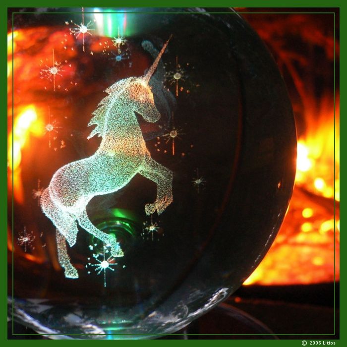 Hochwertige, kristallklare Glaskugel mit Laserfigur “Einhorn mit Sternen”.