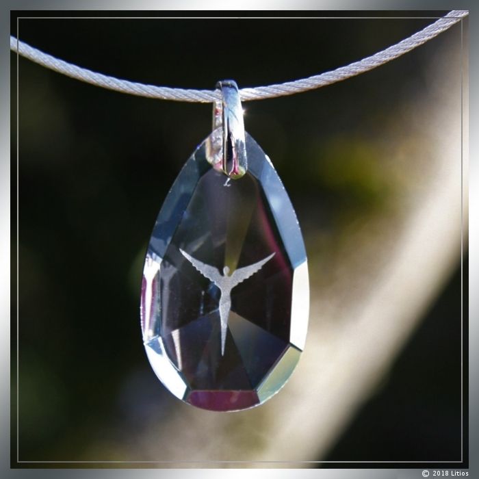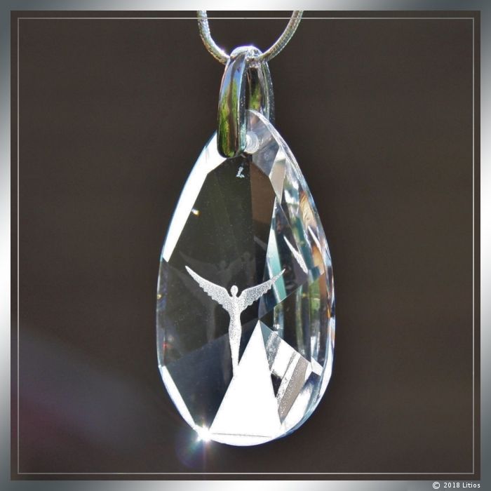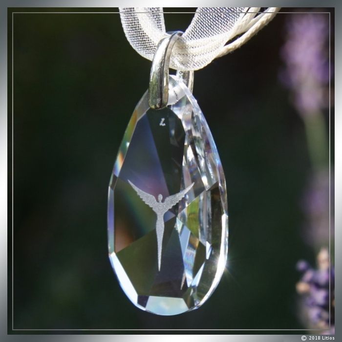 Hochwertiger, kristallklarer Glas-Anhänger mit fein geschliffenen Facetten und sandgestrahlter Engel-Figur.