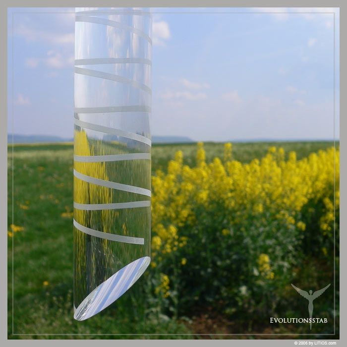 Hochwertiger Glasstab mit eingravierter Spirale aus zwölf linksdrehenden Windungen. Der Stab ist an einer Stirnseite abgeschrägt.