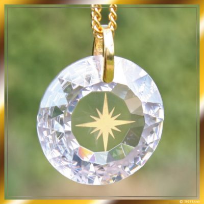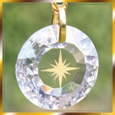 Hochwertiges brillierendes Zirkonia-Medaillon mit fein geschliffenen Facetten und sandgestrahltem gleichschenkeligem „Kreuz mit Strahlen“. Dieses Symbol ist mit Echtgold handbemalt. Am oberen Ende des Anhängers ist eine Öse angebracht, die zur Aufhängung dient. Die Öse besteht aus vergoldetem Echtsilber (925).