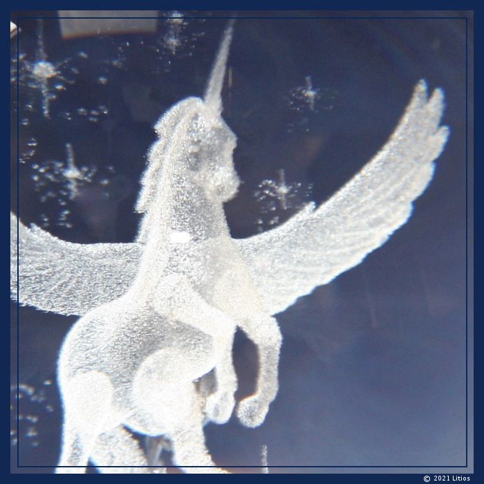 Hochwertiger kristallklare Glaskugel mit Laserfigur „Pegasus-Einhorn mit Sternen“.