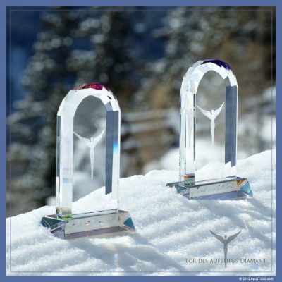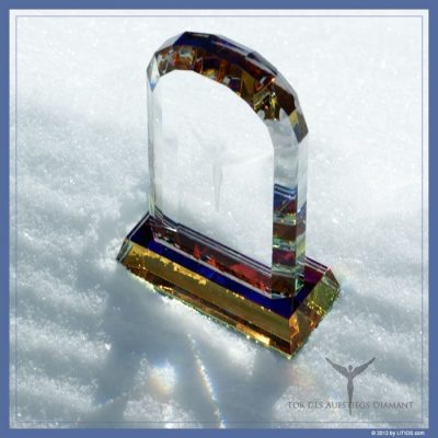 Hochwertiges Glastor mit feinem Schliff, Facettierungen und Engelsfigur innen gelasert und farbiger AB-Beschichtung unter dem Glaspodest gelasert.