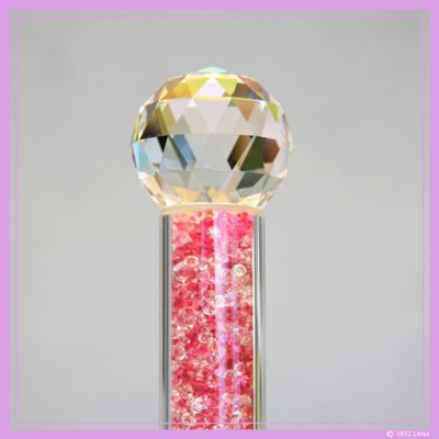 Hochwertiger Glas-Stab, der mit kleinen kristallklaren und rosafarbenen Glas-Diamanten gefüllt ist. An einer Stirnseite ist eine facettierte Glaskugel befestigt. Das andere Ende des Stabes ist abgeflacht.