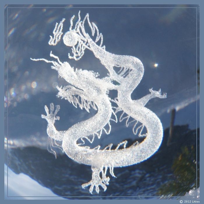 Hochwertige, kristallklare Glaskugel mit Laserfigur “Drache”.