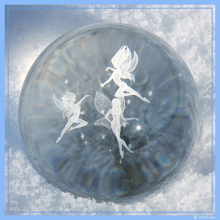 Hochwertige, kristallklare Glaskugel mit Laserfigur “Drei tanzende Elfen”.