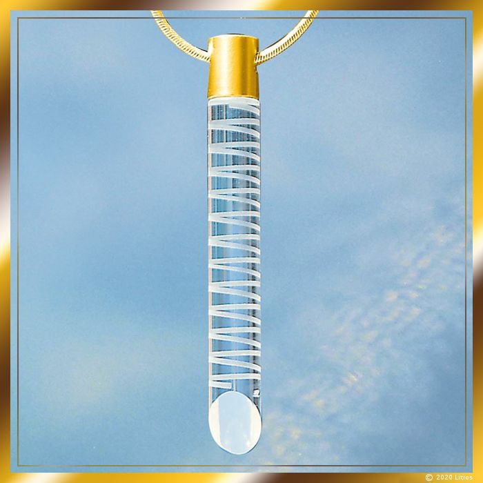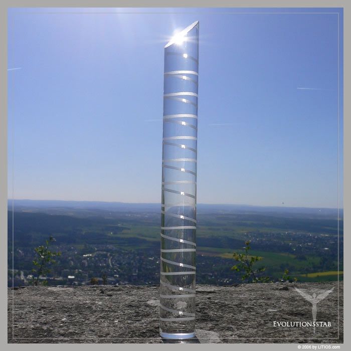 Hochwertiger Glas-Stab mit eingravierter Spirale aus zwölf linksdrehenden Windungen. Der Stab ist an einer Stirnseite abgeschrägt. An der gegenüberliegenden Stirnseite ist ein Zylinder mit Lochbohrung angebracht, der zur Aufhängung dient. Der Zylinder besteht aus vergoldetem Edelstahl.