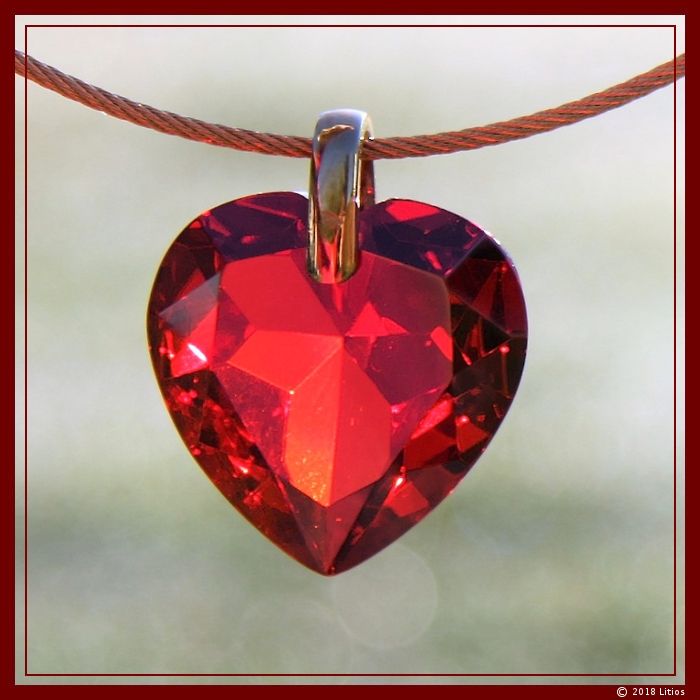 Hochwertiges rubinrotes Zirkonia-Herz mit fein geschliffenen Facetten. Am oberen Ende des Anhängers ist eine Öse angebracht, die zur Aufhängung dient.