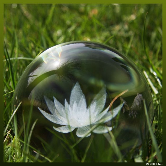Hochwertige, kristallklare Glaskugel mit Laserfigur “Lotus”.