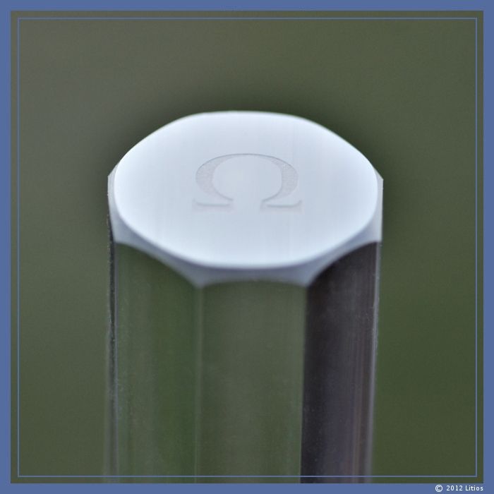 Hochwertiger achteckiger Glas-Stab mit fein geschliffenen Facetten. Auf einer Stirnseite ist ein sandgestrahltes Alpha „α“ und auf der anderen Stirnseite ein Omega „Ω“.