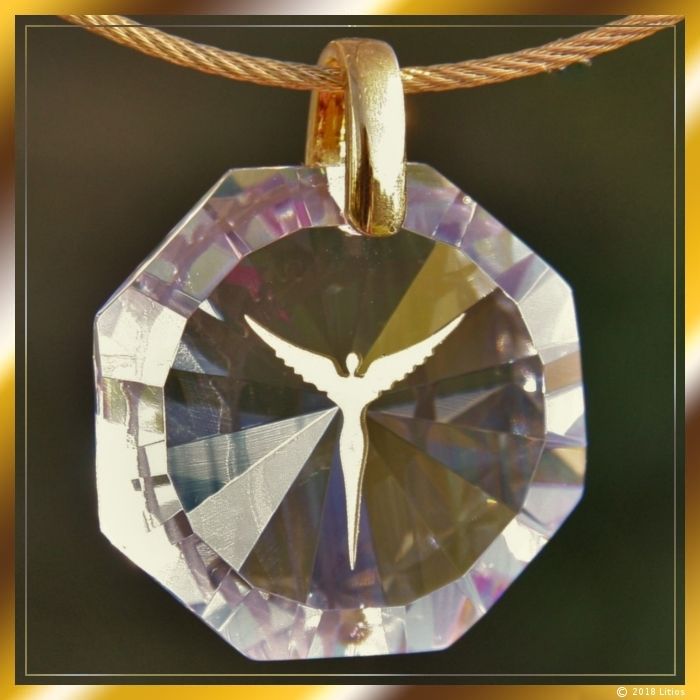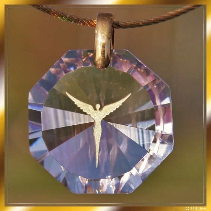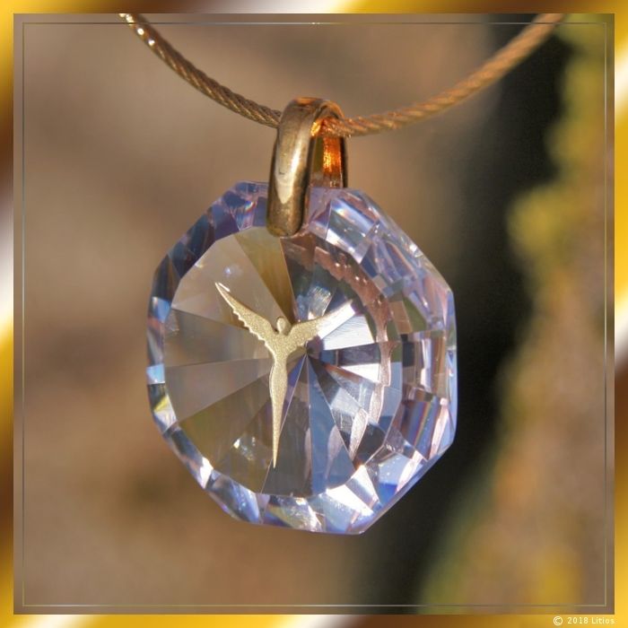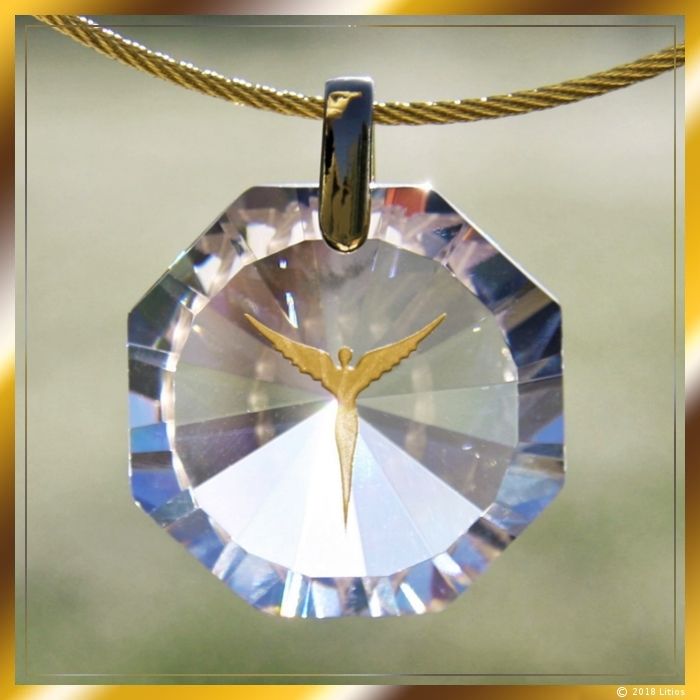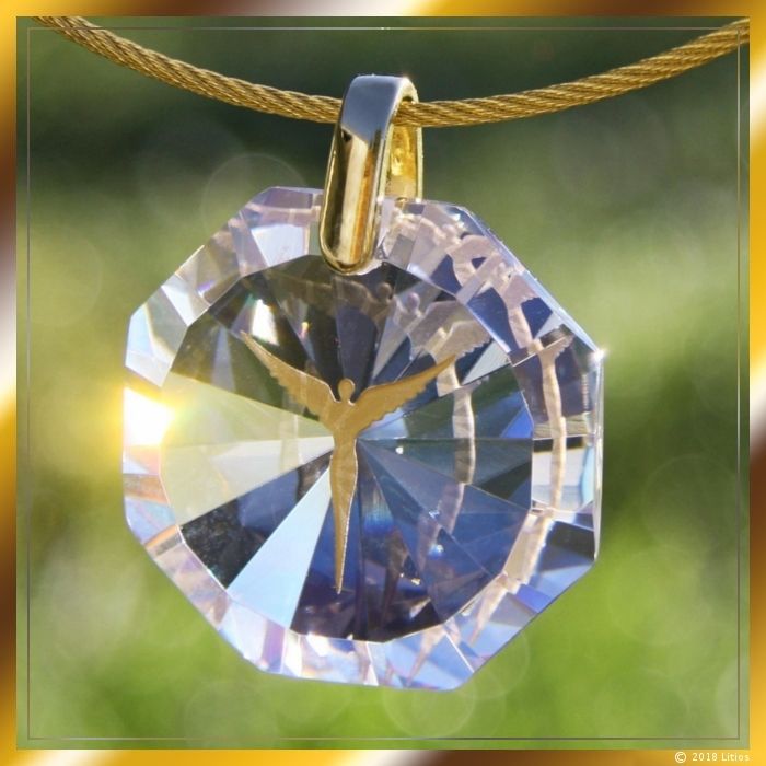 Hochwertiges brillierendes Zirkonia-Medaillon mit fein geschliffenen Facetten und sandgestrahlter Engel-Figur. Die Engel-Figur ist mit Echtgold handbemalt. Am oberen Ende des Anhängers ist eine Öse angebracht, die zur Aufhängung dient. Die Öse besteht aus vergoldetem Echtsilber (925).